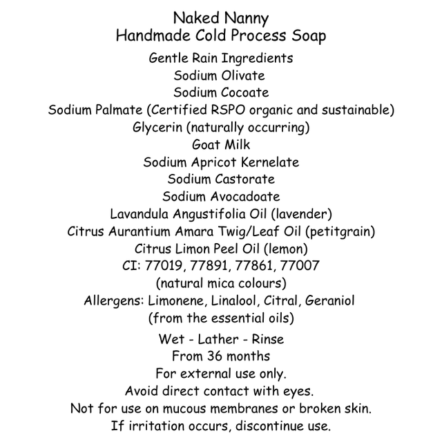 Gentle Rain is a refreshing handmade soap created with Fresh Goat Milk, traditionally used in soap for its creamy texture and its gentleness on even the fussiest of skin types. Rich Avocado oil and gentle Castor oil, help provide the soft, creamy, long lasting lather. A careful blend of Petitgrain, Lavender and Lemon essential oils offer an uplifting, fresh and slightly earthy scent inspired by the clean air after a rain shower.