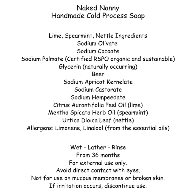 Experience the rich, creamy lather of our Spearmint, Lime and Nettle soap, crafted with reel beer for softness and bubbles. Home grown ground nettles provide exfoliation, while Lime and Spearmint essential oils invigorate your senses with a fresh, herbal aroma. This all-natural bar is perfect for those who love a refreshing and scrubby cleanse.