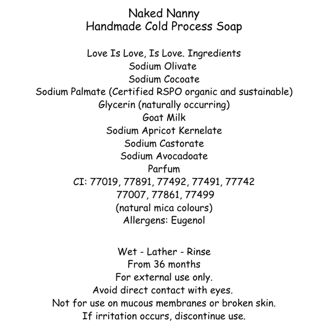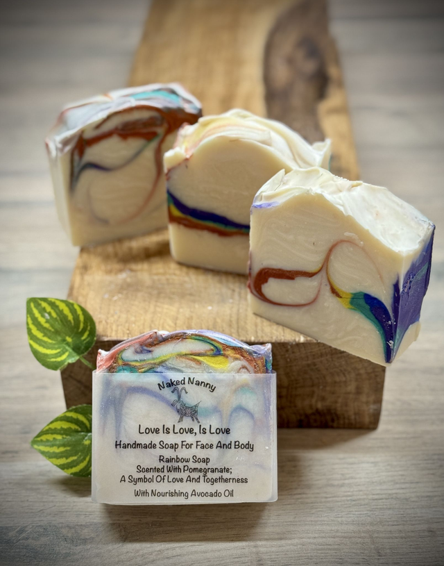 Love is Love, is Love. is a vibrant handmade soap crafted with Avocado, Castor and Apricot Kernel oils, Scented with the rich, fruity aroma of black Pomegranates, this bar features a striking swirly rainbow design throughout, celebrating diversity and joy in every use. Carefully formulated to provide a long-lasting mild, creamy, rich and gentle lather that cleanses without stripping your skin of its natural oils. Delicately fragranced with a luxuriously fruity perfume and decorated with a swirl that runs through the entire bar, making each piece unique and visually uplifting.